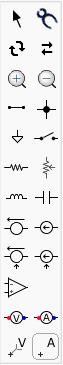 Trên giao diện của phần mềm, nút lệnh đầu tiên đó chính là: direct current (dòng điện một chiều).Bạn kích chọn lên nút lệnh đấy, chương trình sẽ tự động thay đổi nút lệnh alternating current (dòng điện xoay chiều). Với mỗi nút lệnh này, chương trình sẽ hiển thị các bộ nút lệnh công cụ tương ứng. Đây là nút lệnh giúp các bạn chọn kiểu mạch điện để vẽ sơ đồ.